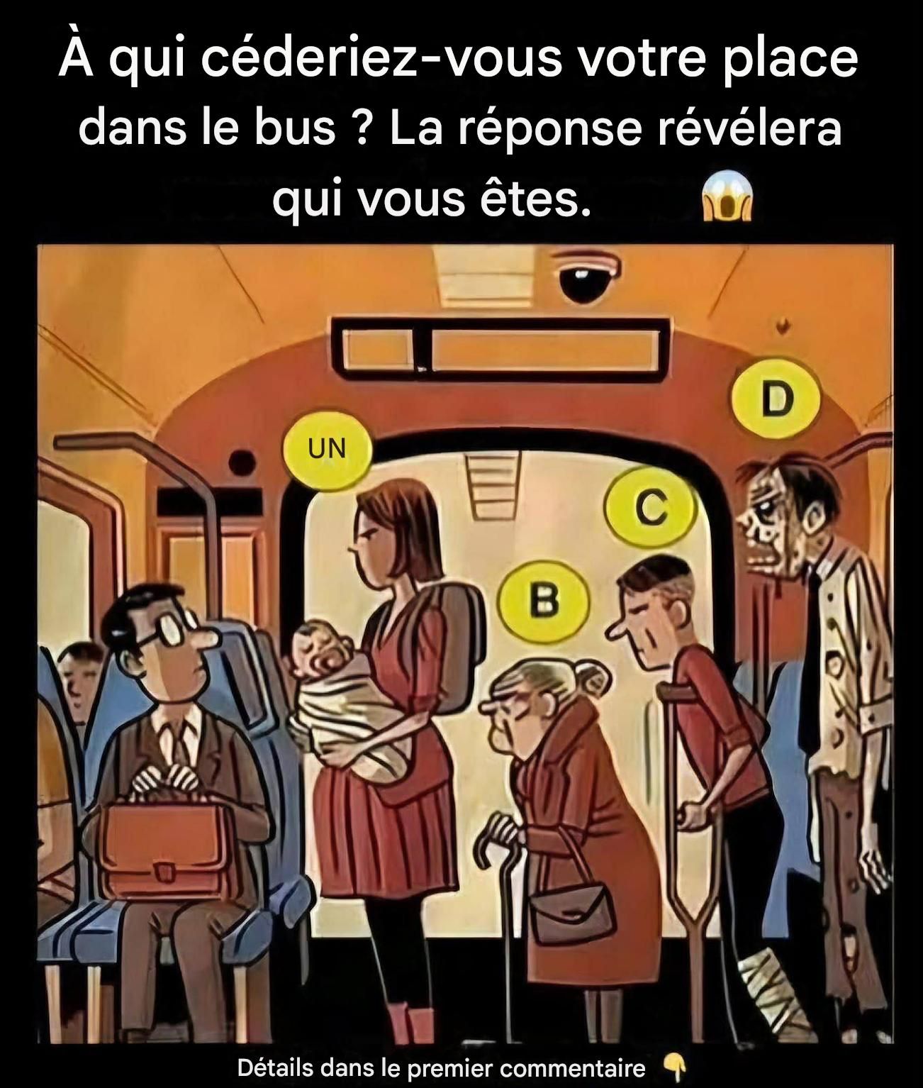 Vous êtes dans un bus plein à craquer et il ne reste qu'un siège seul vide. Quatre personnes en ont besoin : une mère avec un bébé, une personne âgée, un homme avec des béquilles et une personne qui semble malade. À qui le proposez-vous ?
