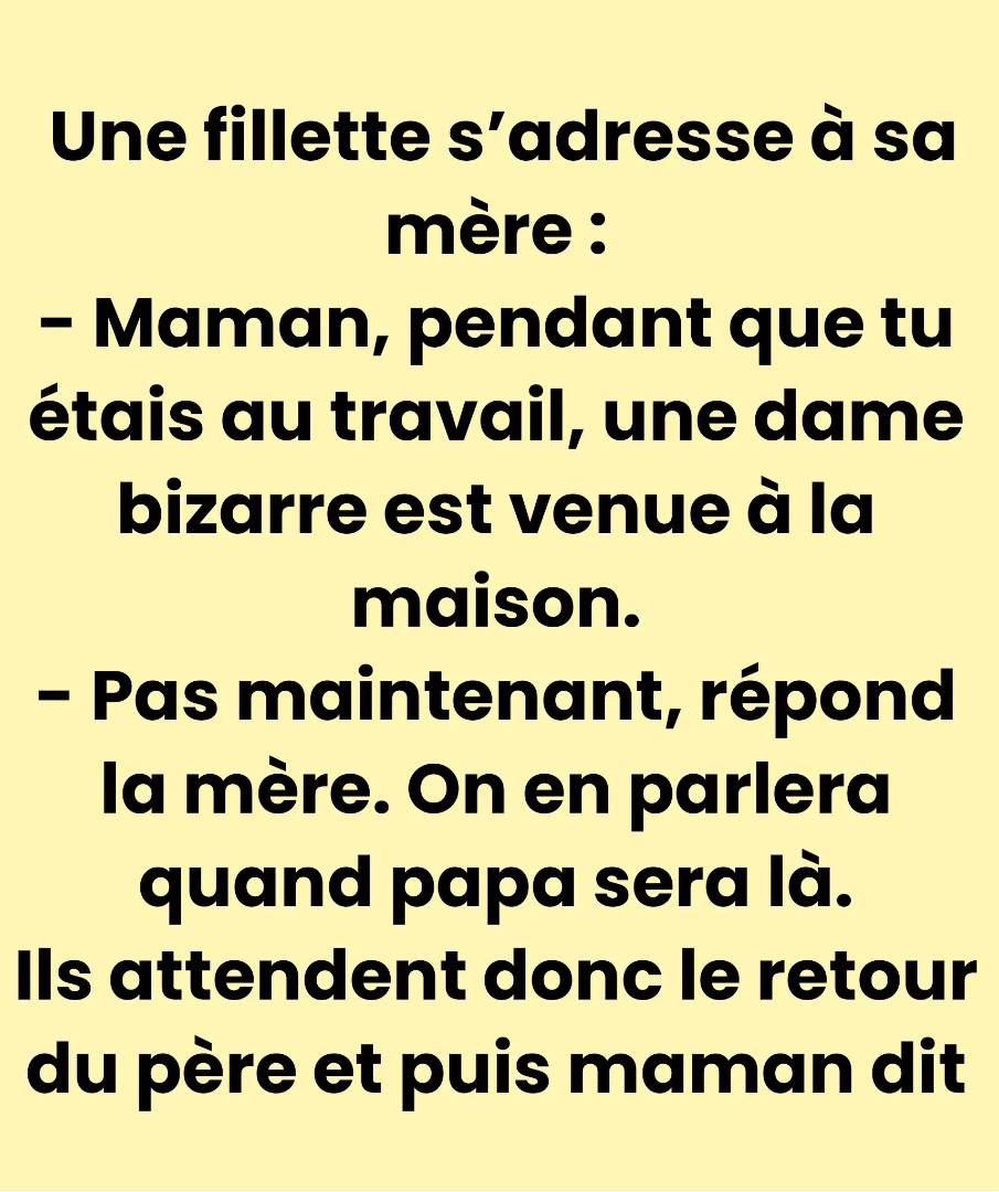Une petite fille, toute innocente, s’assoit à table et, avec son petit air malicieux, lance une phrase qui va faire voler en éclats la tranquillité de sa famille : « Maman, quand tu étais au travail, une dame bizarre est venue à la maison. » Si cette déclaration semblait anodine, elle cache en réalité bien plus qu’elle n’en a l’air. Maman, absorbée dans ses tâches, se fige instantanément. Une dame bizarre ? Cette mention déclenche des soupçons, mais Maman préfère remettre la discussion à plus tard, en attendant l’arrivée de Papa.