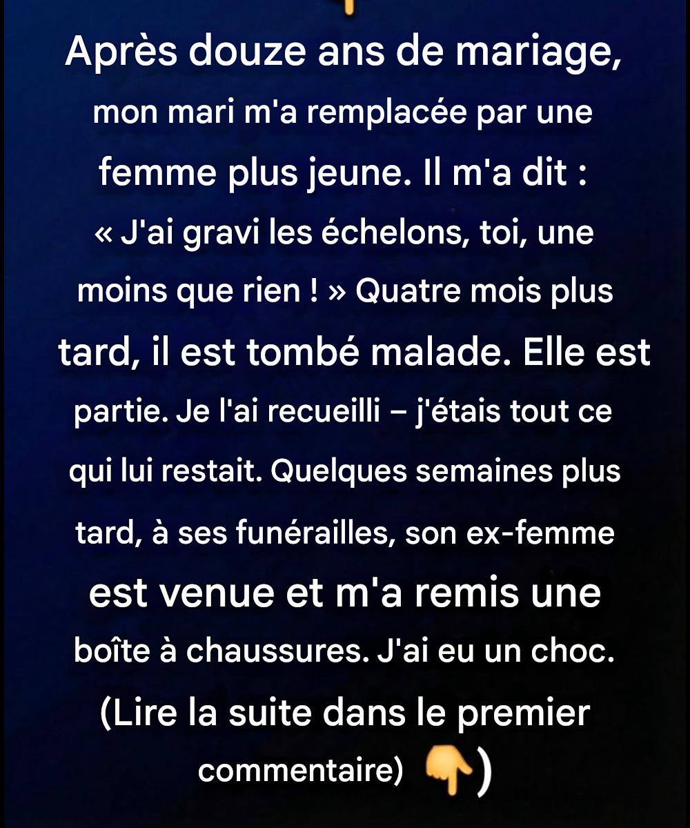 Quelques mois plus tard, sa vie bascula d'une manière totalement imprévue. Son ex-mari tomba gravement malade, et celle qui l'avait remplacée préféra disparaître plutôt que d'affronter les hôpitaux, l'incertitude et les responsabilités. Lorsqu'il la contacta, affaibli et seul, elle fut elle-même surprise d'ouvrir sa porte. Non par devoir. Non par nostalgie. Mais parce que la compassion existait encore en elle. Elle l'accompagna à ses rendez-vous médicaux, prépara ses repas et partagea avec lui ces soirées silencieuses, empreintes d'une émotion profonde, chargées de non-dits.