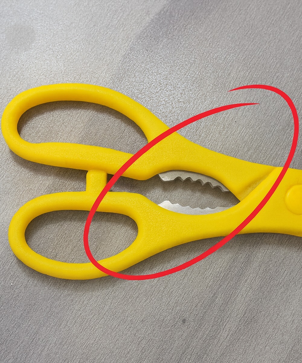 Regardez vos ciseaux de cuisine de plus près. Entre les deux branches, là où vos doigts se posent naturellement, se trouve une zone striée. Lorsque vous refermez légèrement les poignées, ces dents s’emboîtent parfaitement.