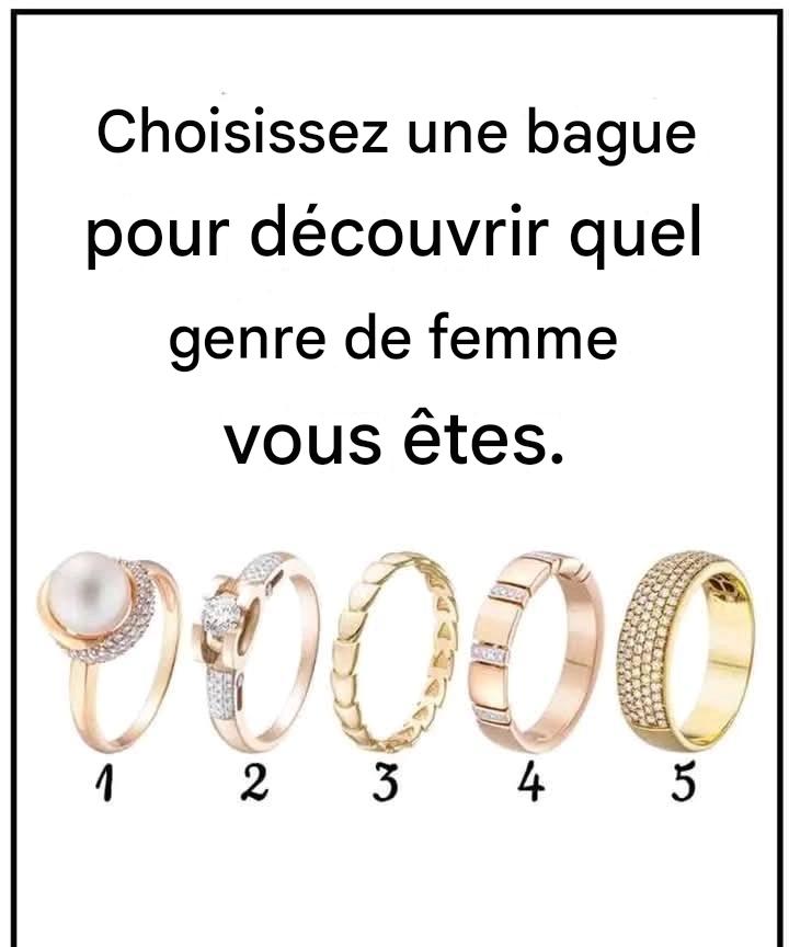Observez les cinq bagues sur l'image ci-dessus et choisissez celle qui vous attire immédiatement. N'hésitez pas, choisissez simplement celle qui vous correspond le mieux. Une fois votre choix fait, lisez la description ci-dessous pour découvrir ce qu'il révèle de votre personnalité.