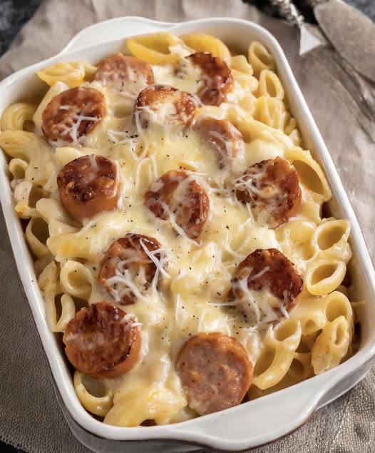 Ce savoureux et copieux gratin de pâtes polonais associe de la kielbasa fumée et de la choucroute acidulée à des pâtes penne crémeuses, le tout gratiné sous une riche sauce suisse au fromage.