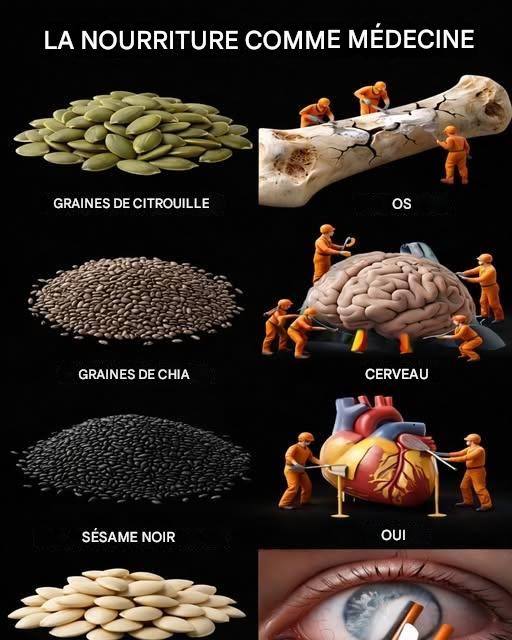 Les associations illustrées ici illustrent cette synergie naturelle. Les graines de citrouille sont des puissants renforcements osseux riches en magnésium, zinc et phosphore, qui agissent comme une équipe spécialisée de réparation. Ces minéraux aident à combler les micro-fissures et à renforcer la structure squelettique, favorisant la densité et la résilience au fil du temps.