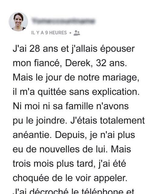 Quelques jours plus tard, sa mère est venue chez moi, en larmes. Elle m'a expliqué que Derek s'était enfui avec une de ses ex. Apparemment, ils s'étaient reparlés une semaine avant le mariage, et il avait décidé de tout plaquer pour elle. Sa famille était choquée, tout comme moi. Je n'ai eu de ses nouvelles que trois mois plus tard, quand il m'a enfin appelé pour s'excuser. Il m'a raconté que son ex lui avait caché qu'elle avait eu un enfant de lui et qu'il voulait être là pour eux. Je n'ai presque rien dit, juste un « bonjour » et basta. J'étais vide d'idée.