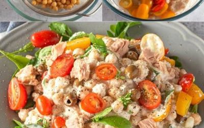 Image ingrédients Pois chiches déjà bouillis 500 grammes Thon bien égoutté à l’huile 160 grammes Yaourt grec nature 4 cuillères…