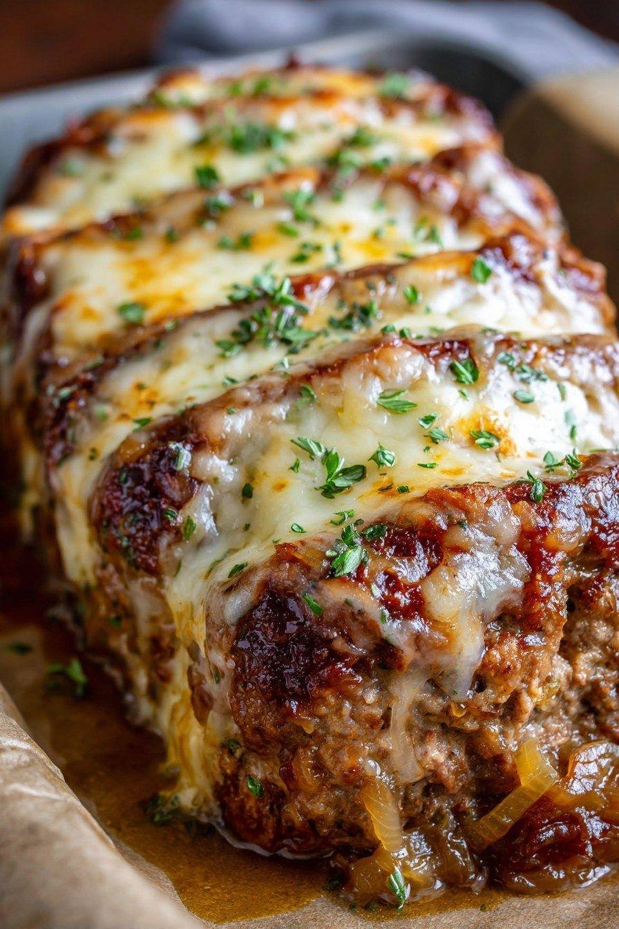 Ce pain de viande à l'oignon français transforme un classique réconfortant en un plat vraiment exceptionnel. Il s'imprègne des saveurs riches et savoureuses de la soupe à l'oignon, le tout étant recouvert d'une généreuse couche d'oignons caramélisés et d'une onctueuse sauce au fromage gratinée. C'est un repas copieux et raffiné, idéal pour un dîner en famille ou une occasion spéciale.