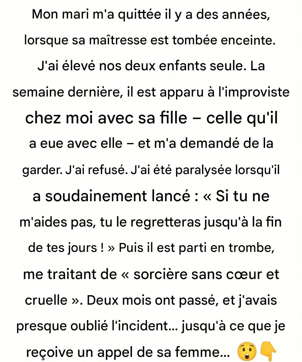 J'ai regardé l'enfant – innocente, inconsciente du passé qu'elle portait en elle – puis je l'ai regardé lui. J'ai repensé aux nuits blanches passées à m'inquiéter seule. Aux anniversaires qu'il avait manqués. À la force que j'avais acquise sans lui. Et j'ai compris quelque chose avec une clarté surprenante : je ne lui devais rien.