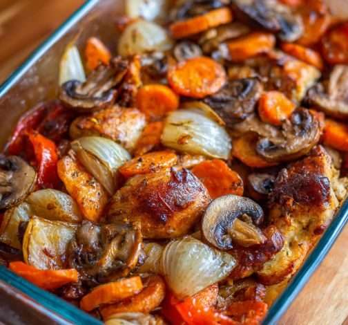Ce gratin de poulet et légumes cuit au four est un excellent exemple de la façon dont la cuisson d'ingrédients simples à haute température révèle des saveurs riches et caramélisées. Les champignons apportent une profondeur terreuse qui se marie parfaitement avec la douceur naturelle des carottes et des oignons rôtis.