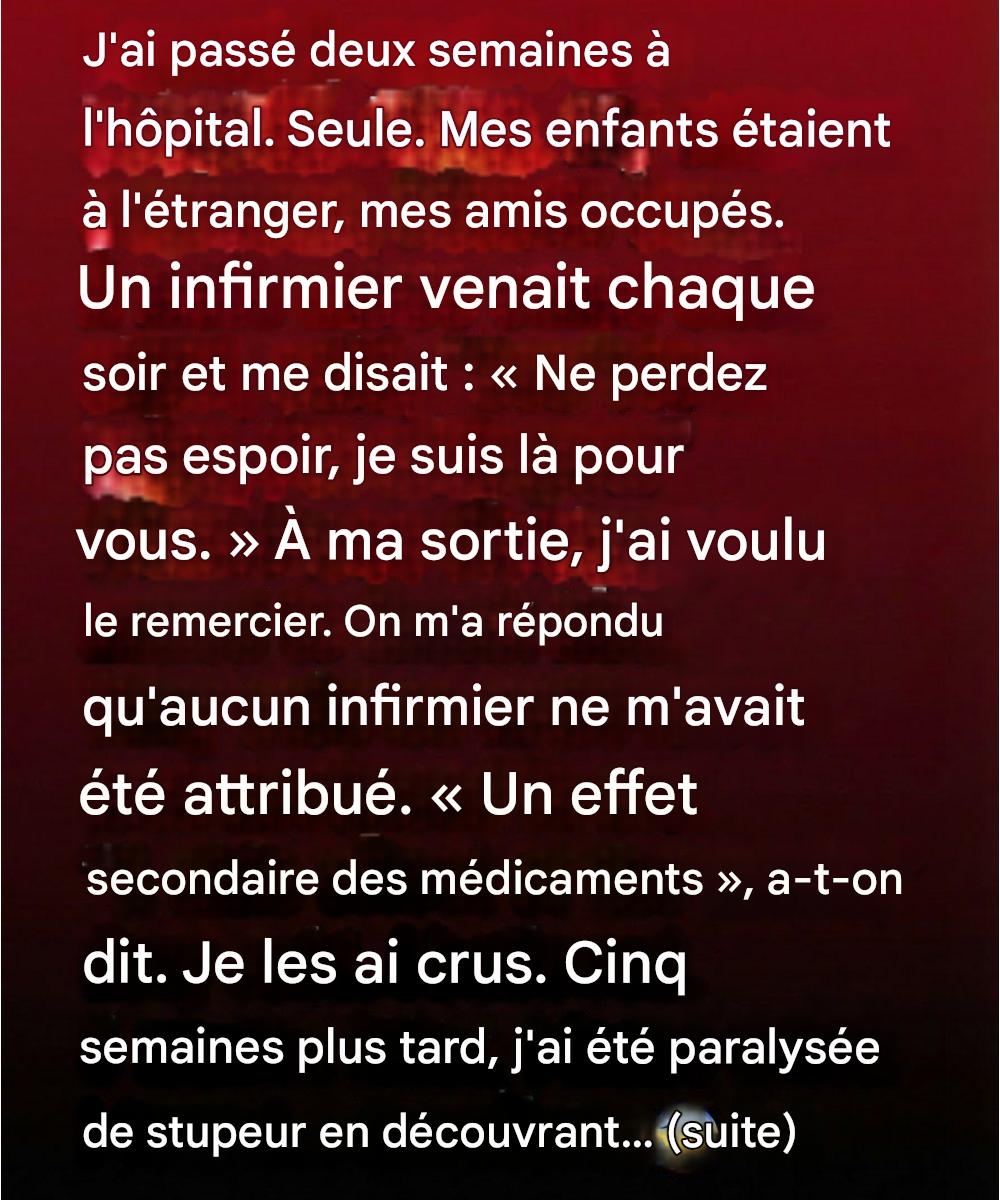 Mes enfants vivaient dans des villes différentes, à des heures de route. Mes amis étaient bien intentionnés, mais leurs vies étaient chargées, remplies de responsabilités que je n'avais plus l'énergie d'assumer. Les visites se succédaient sans que je voie souvent un seul visage familier. Chaque jour s'étirait interminablement, rythmé seulement par le doux bip des machines, le froissement des rideaux et les pas feutrés des infirmières qui changeaient d'équipe.