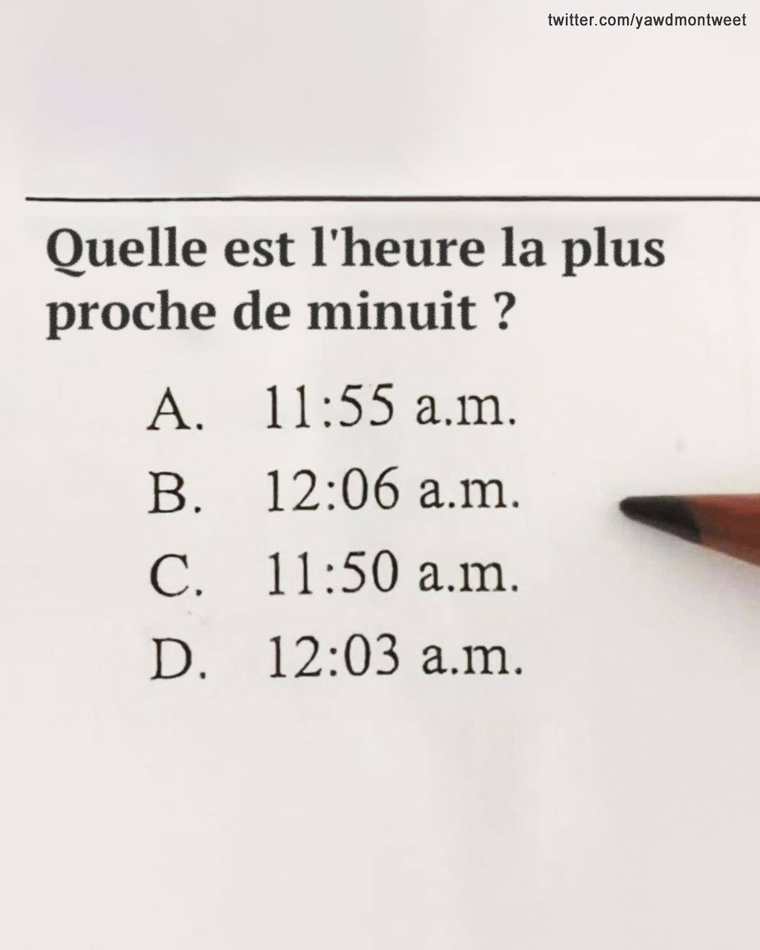 La requête, qui a été vue plus de 1,4 million de fois, proposait quatre options : A. 11h55, B. 12h06, C. 11h50 et D. 12h03. De nombreux utilisateurs ont connu des déconcertés, exprimant diverses réponses dans la section des commentaires.